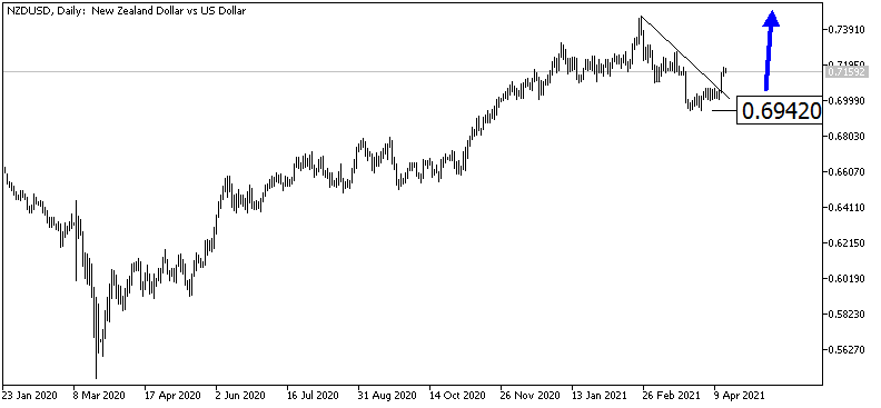 Валутната двойка се намира във възходящ тренд и реализира пробив на съпротива, който осигурява техническа възможност за поскъпване на цената. Идеята за възходящо движение ще отпадне, ако видим пробив на локалния минимум при 0.6942.